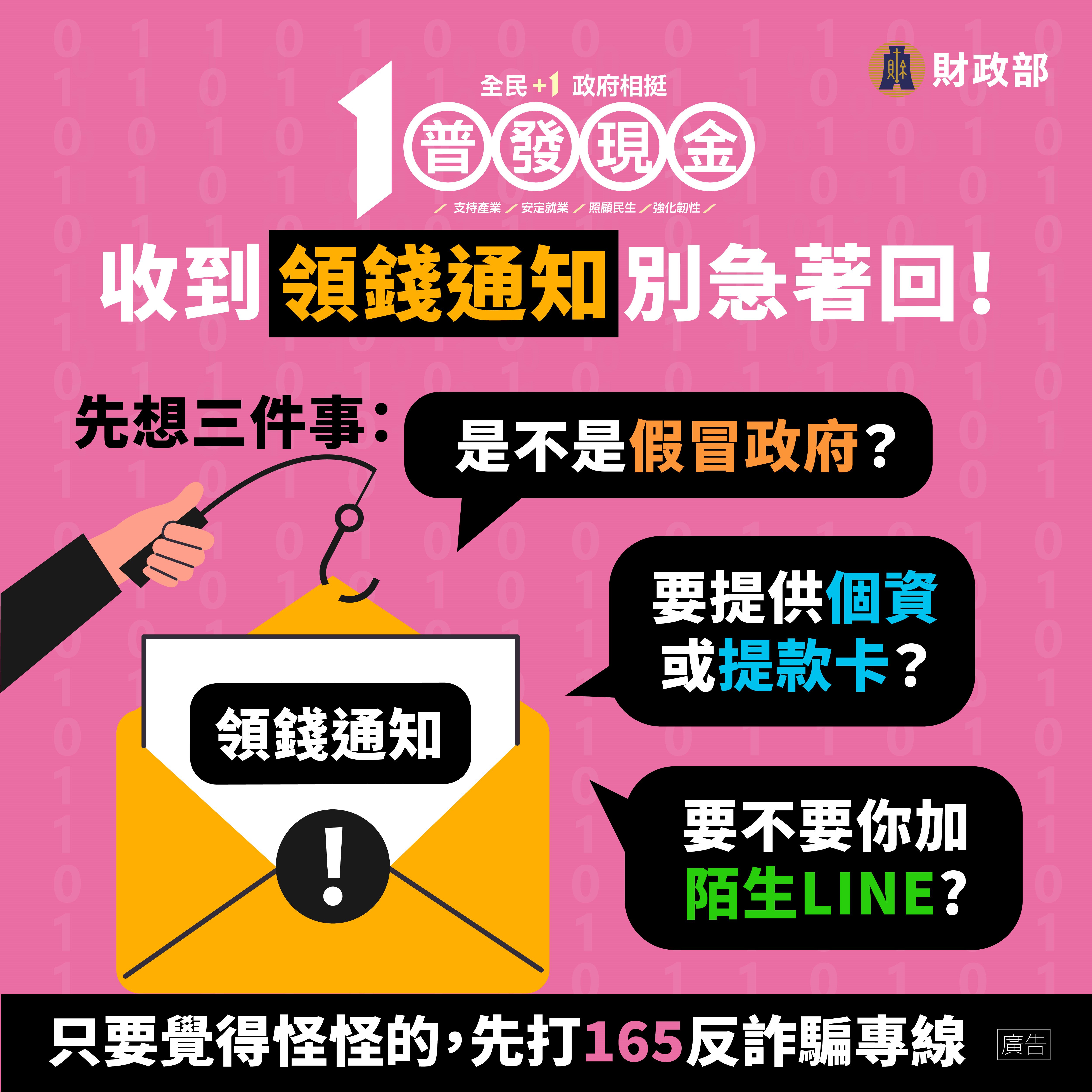 財政部為辦理普發現金作業,已建置「全民+1政府相挺」 普發現金網站及相關宣導影片、文宣圖片。